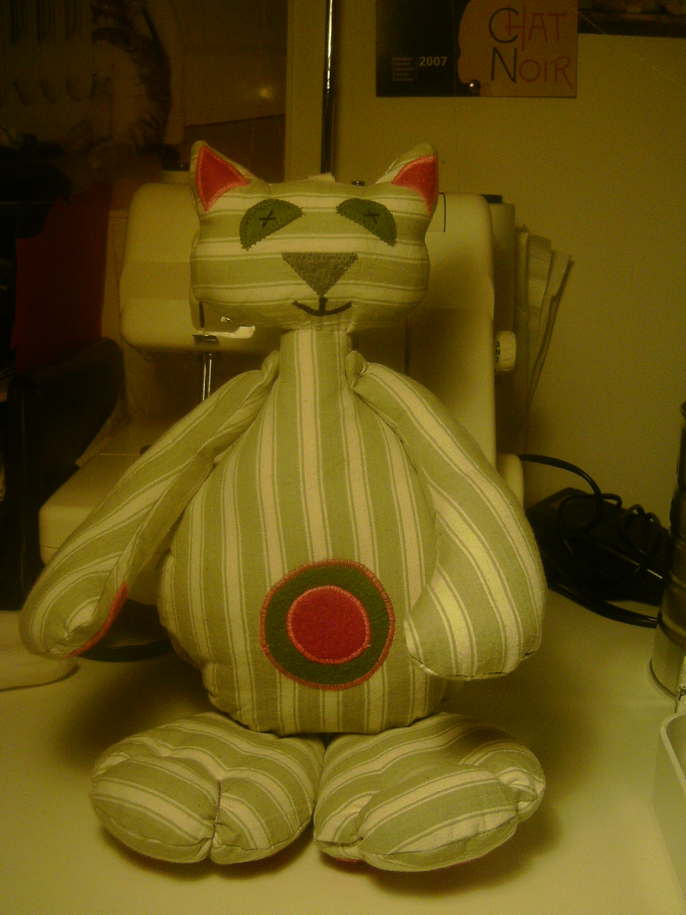 Un autre chat de 28 cm , en polaire vert et coton fleuri  avec un air un peu barré.